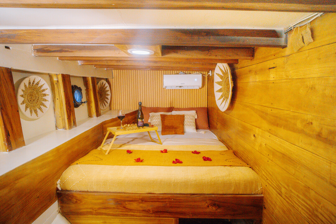 Akassa Phinisi boasts three spacious, air-conditioned cabins with en-suite bathrooms, accommodating up to 10 guests. The Owner's Suite and VIP Suite feature luxurious Jacuzzis and bathtubs on their balconies, while the Deluxe Cabin offers a cozy retreat for two.