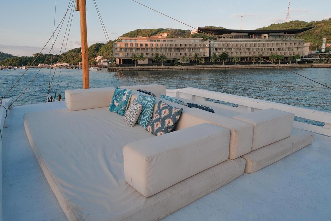 Accommodating 18 guests across five air-conditioned cabins, the North Blue Superior Phinisi offers a perfect blend of luxury and comfort. The upper deck features two master rooms, each with private bathrooms, providing spectacular ocean views. The main deck houses three thoughtfully designed sharing rooms, ideal for families or groups of friends traveling together.
