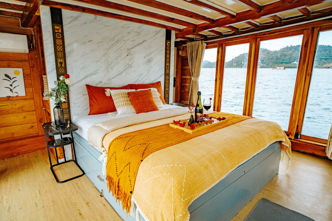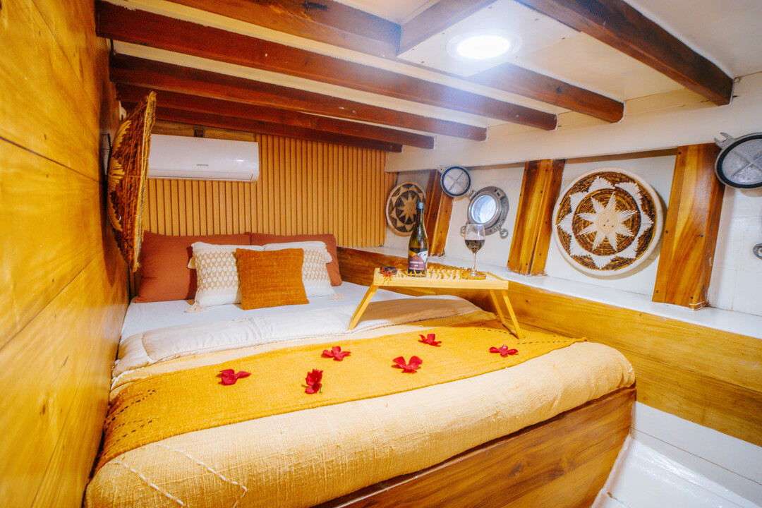 Akassa Phinisi boasts three spacious, air-conditioned cabins with en-suite bathrooms, accommodating up to 10 guests. The Owner's Suite and VIP Suite feature luxurious Jacuzzis and bathtubs on their balconies, while the Deluxe Cabin offers a cozy retreat for two.